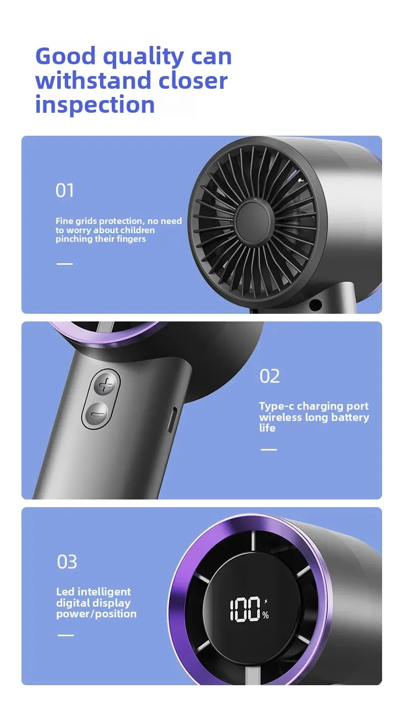 A powerful high-speed handheld fan featuring a brushless motor, real-time digital display, and USB-C fast charging. Compact, quiet, and perfect for office, outdoor use, travel, and study.
